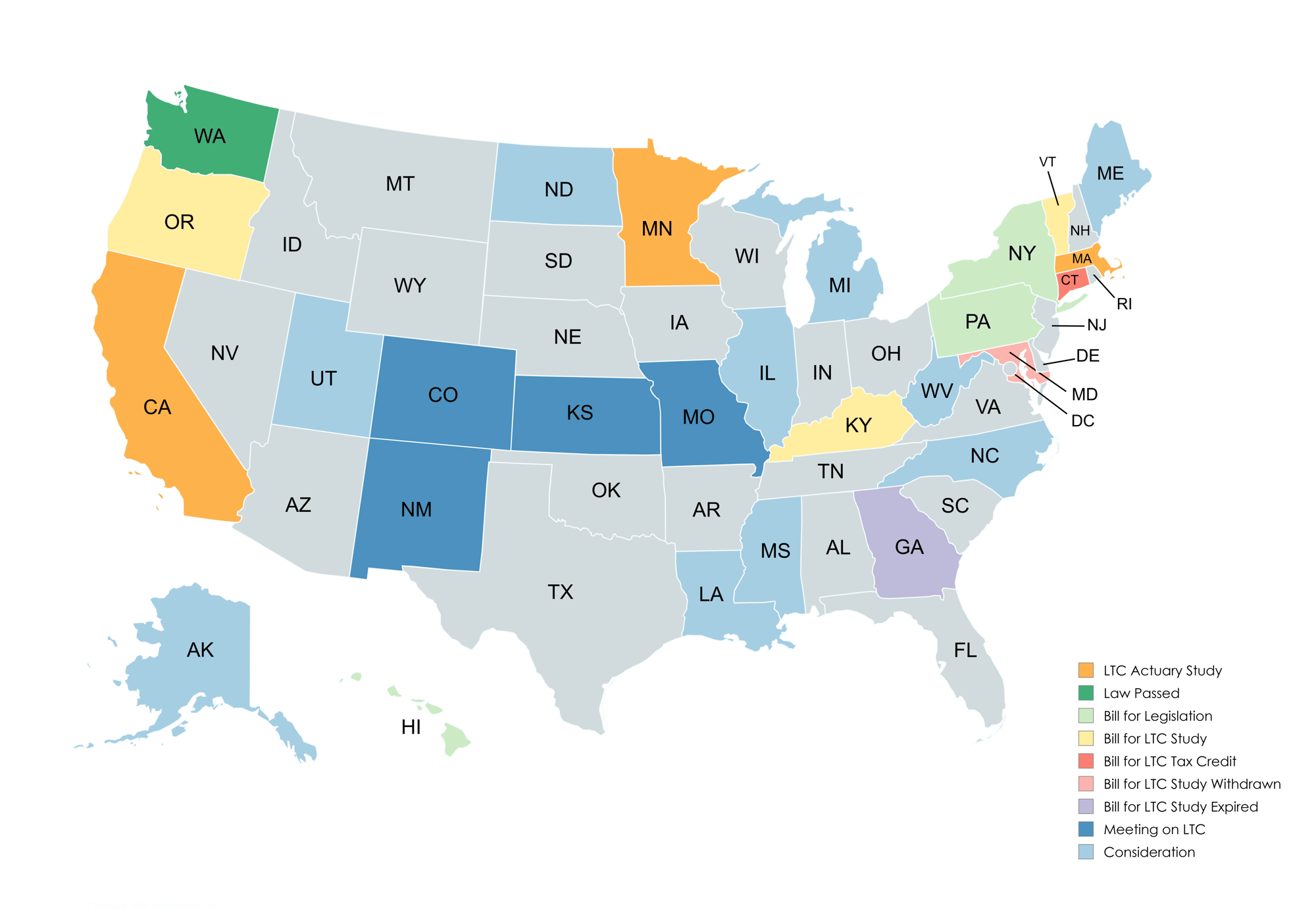 In 2019 the Washington state legislature established the Washington Cares Fund, the nation’s first publicly funded long-term care benefit for eligible workers, to address the future LTC crisis posed by an aging population. This sparked a national conversation about the need for long-term care planning as state Medicaid systems struggle to cover the 70% of Americans that will need LTC in their lifetimes, only 10% of whom have insurance that will pay for it. Many other states have followed suit and are in various stages of evaluating public LTC programs of their own. Depending on how each state designs their plans, qualifying LTC insurance policies may allow individuals to opt out of the payroll tax.